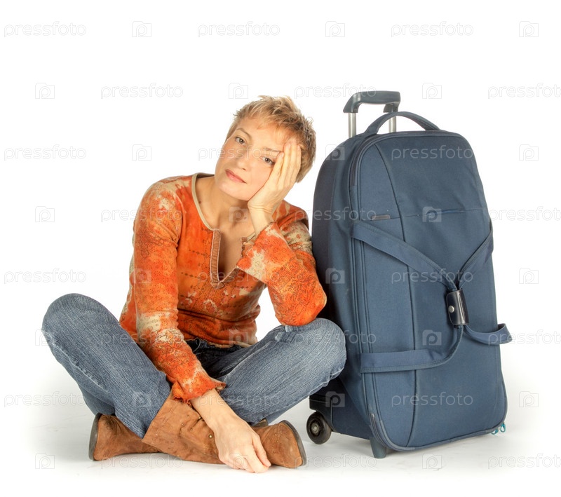Женщина с чемоданом на белом фоне