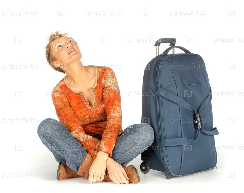 Женщина с чемоданом на белом фоне