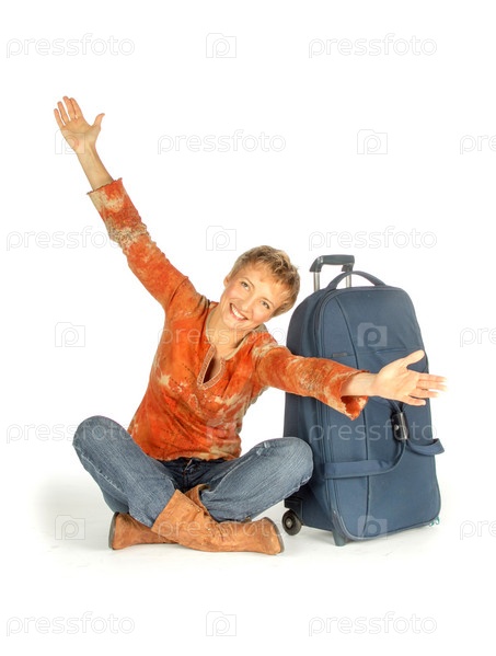 Женщина с чемоданом на белом фоне