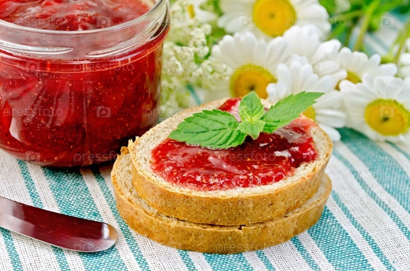 Хлеб с клубничным джемом и ромашками на салфетке