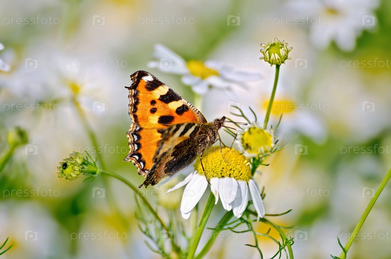 Бабочка оранжевая на ромашке