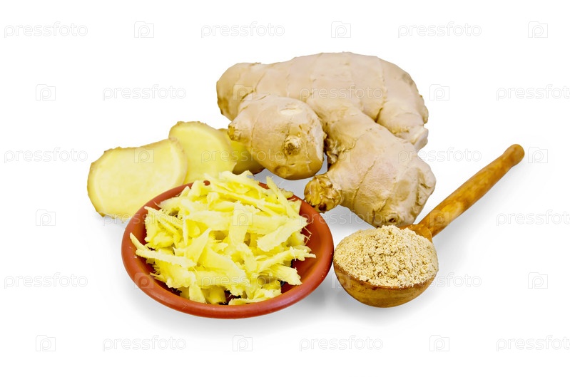 Имбирь тертый в тарелке с порошком в ложке и корнем