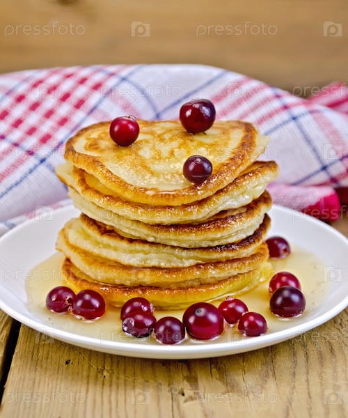 Оладьи с клюквой и медом на доске