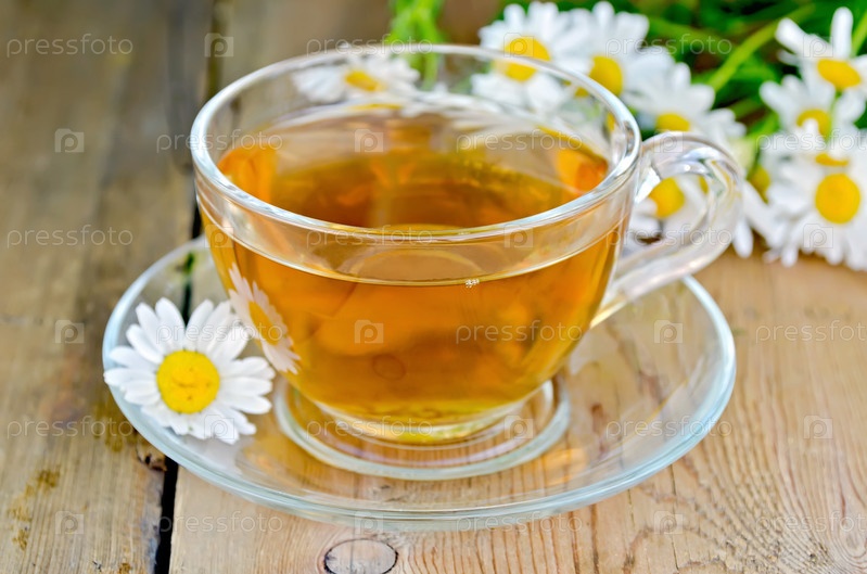 Травяной чай из ромашки в стеклянной чашке на доске
