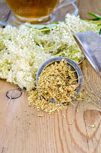 Травяной чай из таволги с ситечком и стеклянной чашкой