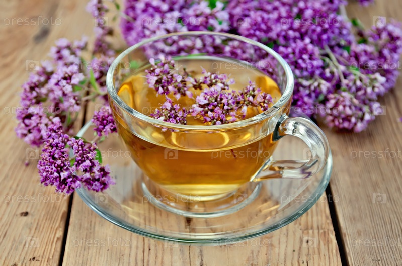 Травяной чай из орегано в стеклянной чашке на доске
