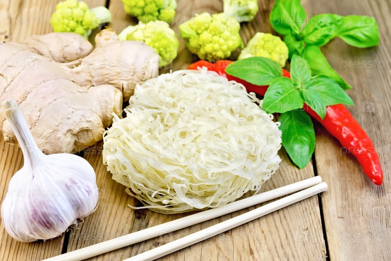 Рисовая лапша со специями и брокколи на доске