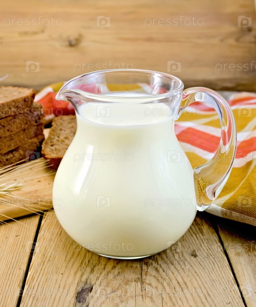 Молоко в кувшине с ржаным хлебом и красной салфеткой