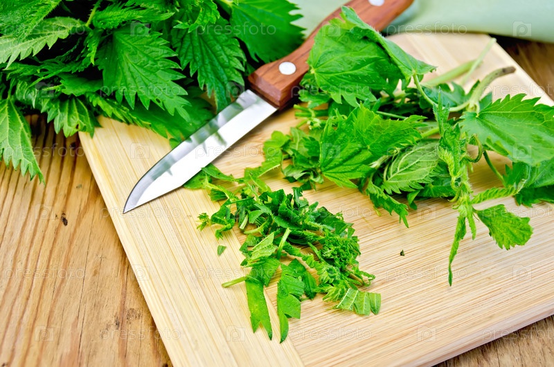 Крапива, нож и салфетка на доске