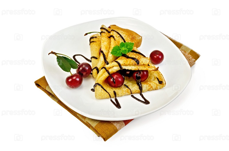 Блинчики с вишней и шоколадным сиропом на салфетке