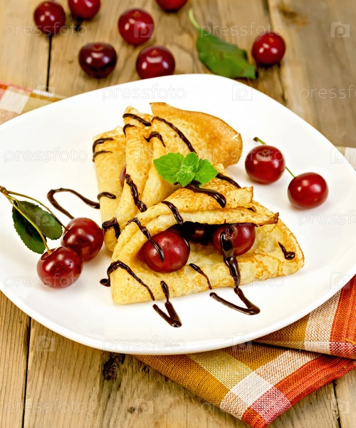 Блинчики с вишней и шоколадным сиропом с салфеткой