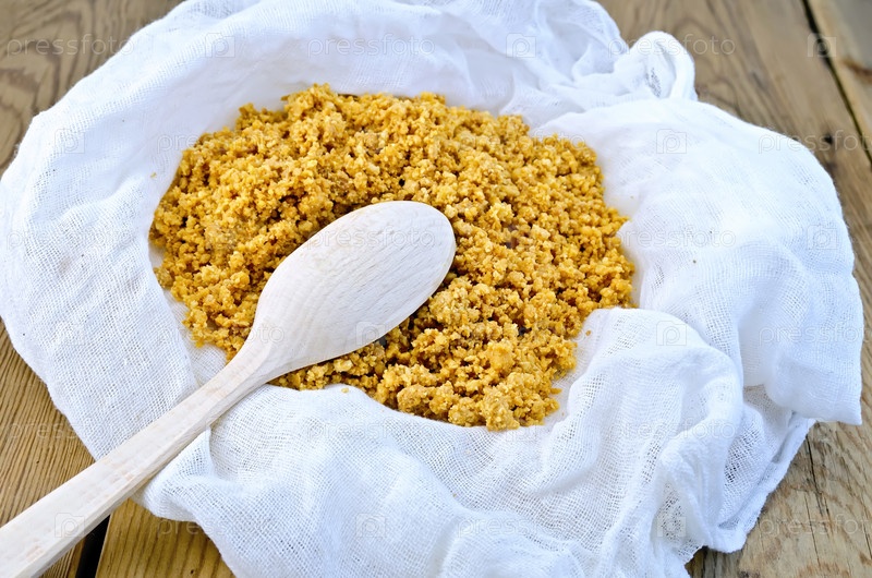 Красный творог в марле с ложкой