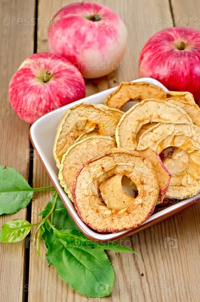 Яблоки свежие и сушеные в чаше на доске