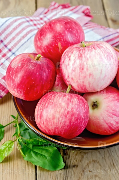 Яблоки красные в керамической тарелке на доске