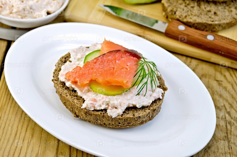 Бутерброд с кремом и семгой на овальной тарелке