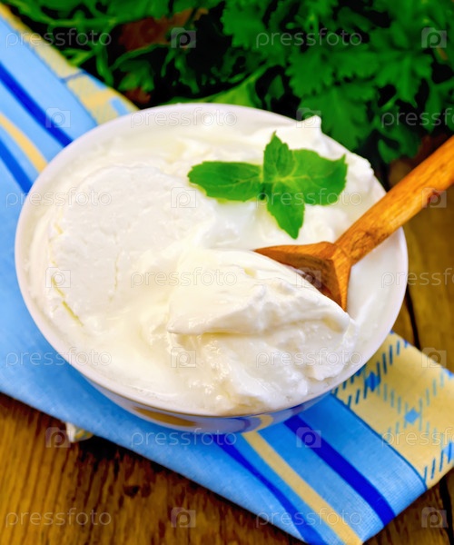 Йогурт в белой чаше с мятой и деревянной ложкой