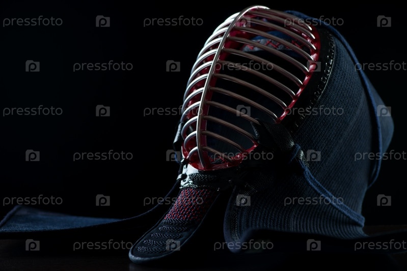 Шлем для занятий кендо на черном фоне
