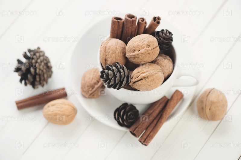 Грецкие орехи, корица и еловые шишки в чашке, вид сверху