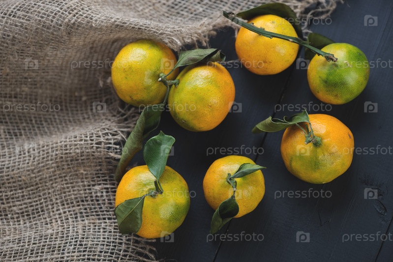 Спелые мандарины с листьями, вид сверху