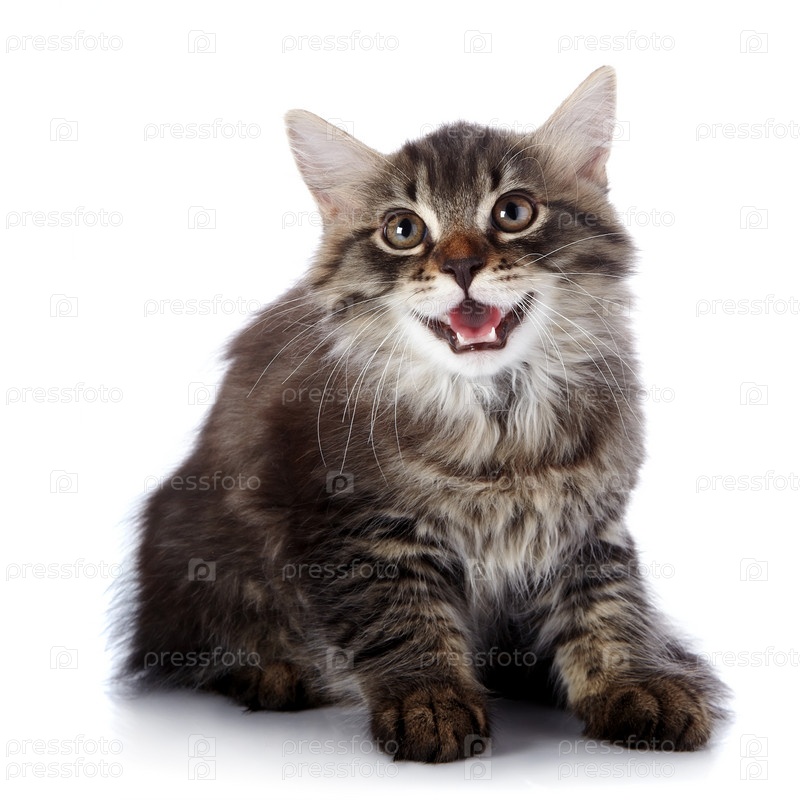 Полосатый пушистый котенок на белом фоне. Маленький хищник
