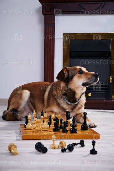 Собака и шахматы у камина