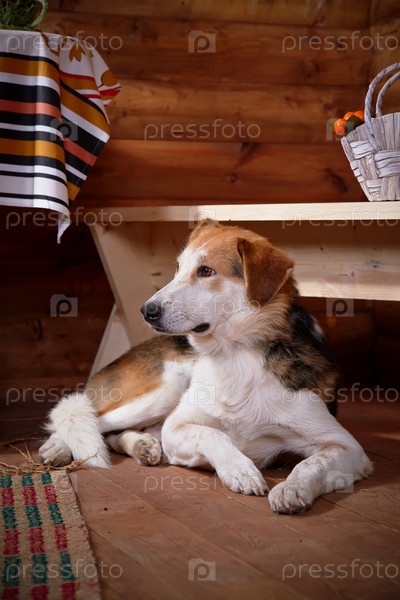 Собака лежит под скамейкой в деревенском доме