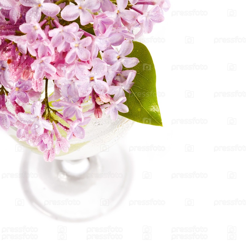 Ветка сирени в стакане на белом фоне