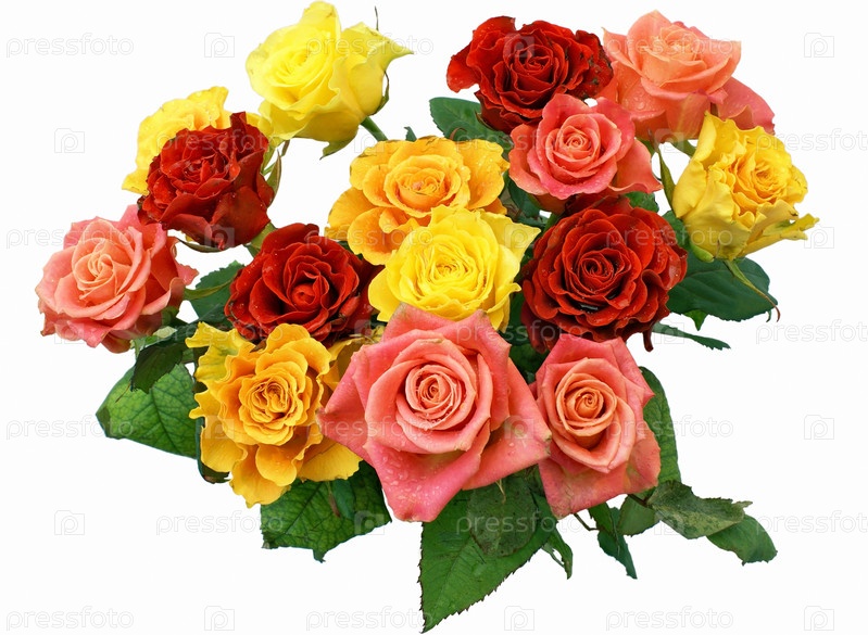 Букет свежих роз с каплями воды, изолированные на белом фоне