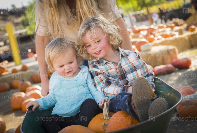 Молодая семья проводит в день на тыквенной ферме