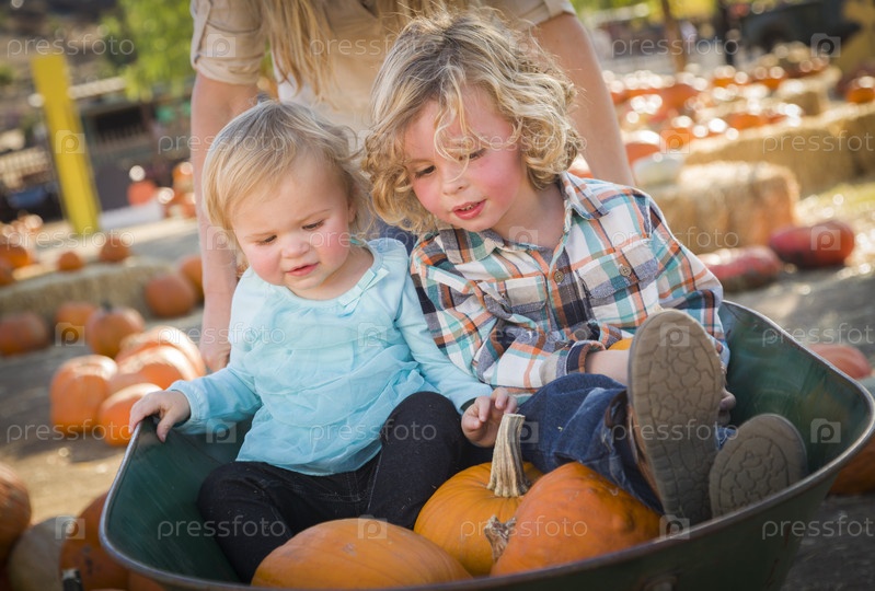 Молодая семья проводит в день на тыквенной ферме