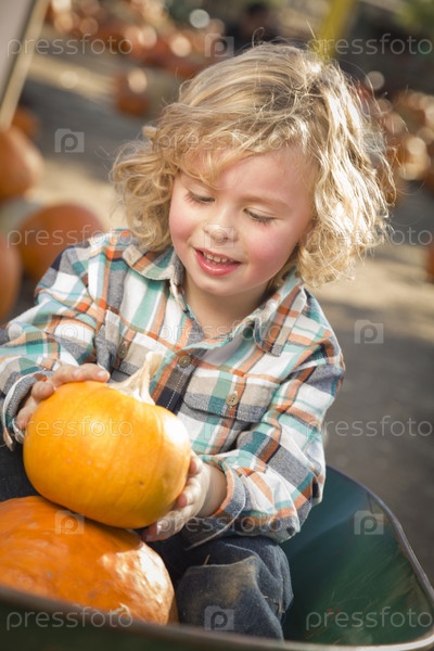 Мальчик сидит на тыквенной ферме