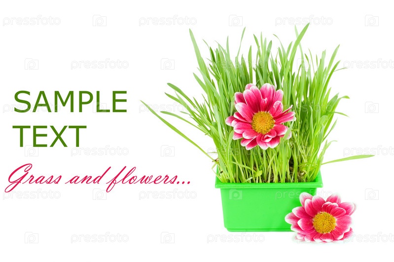 Зеленая трава с цветами в горшочке