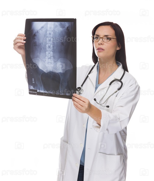Врач или медсестра изучает рентген на белом фоне