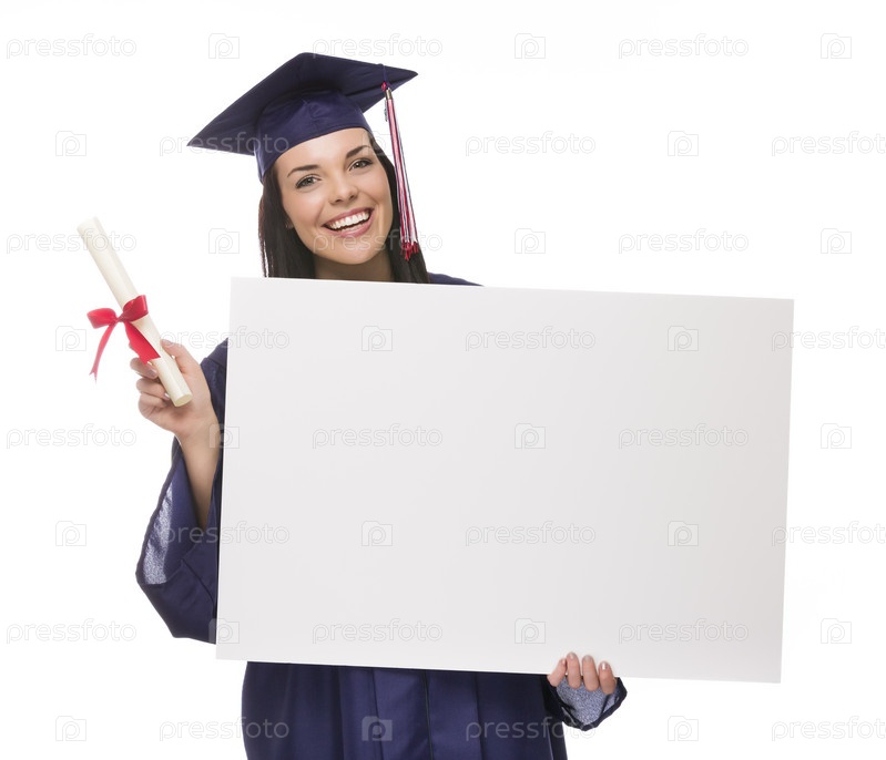 Выпускник в мантии и шапке держит свой диплом и баннер