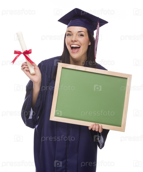 Выпускник в мантии и шапке держит свой диплом и баннер