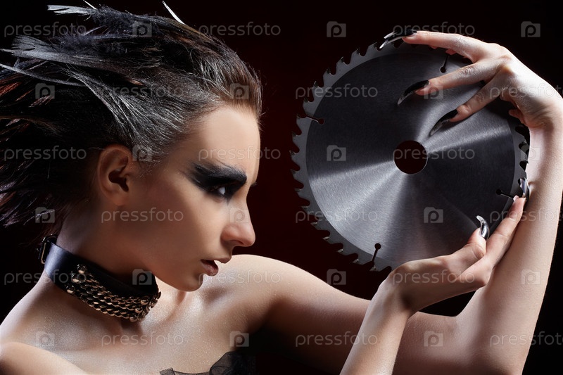 Модель с макияжем в стиле хищной птицы, черными когтями и с циркулярным диском в руках