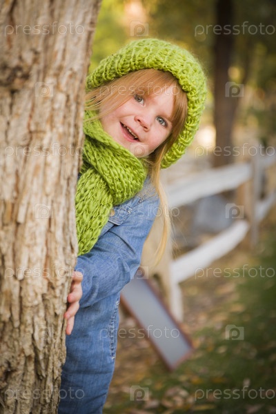 Портрет милой девочки в зеленых шарфе и шапочке
