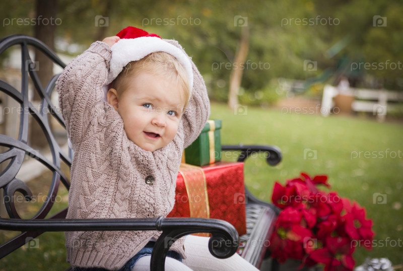 Малыш с новогодними подарками сидит на скамейке