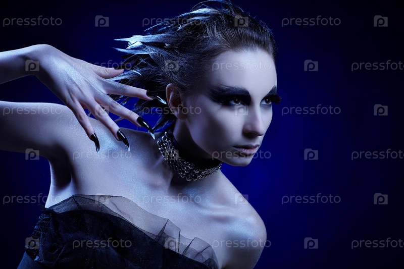 Модель с креативным макияжем в стиле хищной птицы и черными когтями, холодное тонирование