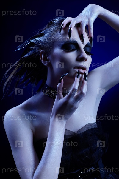 Модель с готическим макияжем и черными длинными ногтями в драматичной позе
