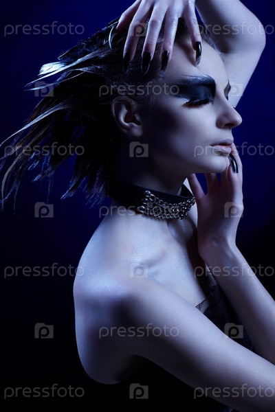 Модель с ярким готическим макияжем и черными длинными ногтями в драматичной позе