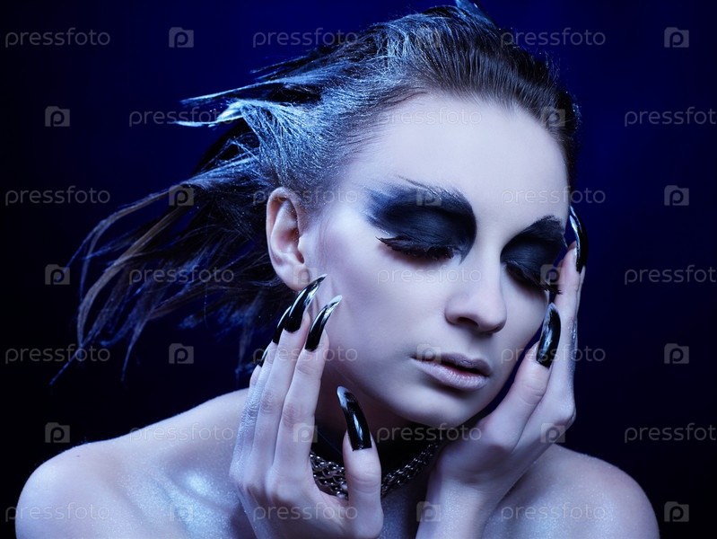 Модель с красивым готическим макияжем и черными длинными ногтями в драматичной позе, холодное тонирование