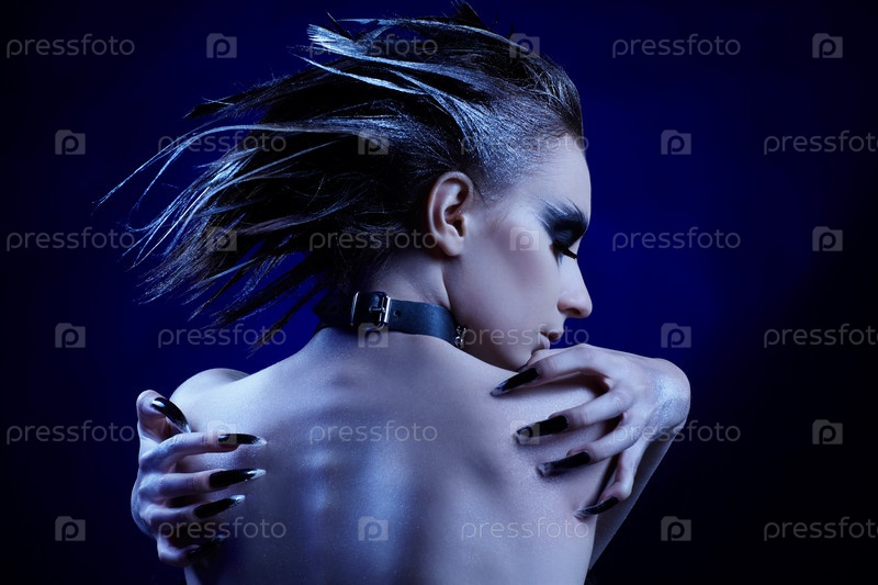 Модель с готическим макияжем и черными когтями позирует спиной к камере
