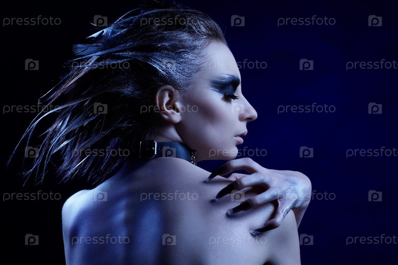 Модель с готическим макияжем и черными когтями позирует спиной к камере