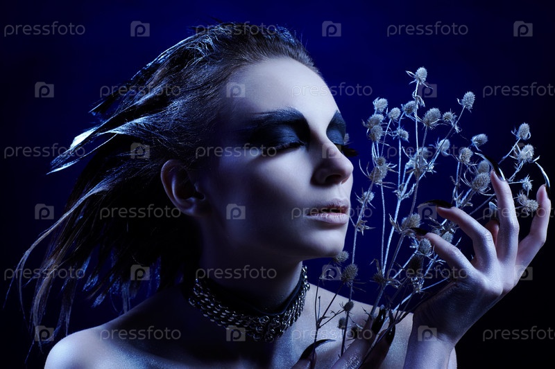 Модель с готическим макияжем и в ошейнике позирует с сорняком в руках