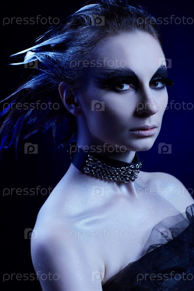 Модель с макияжем в стиле хищной птицы с ошейником, фото с холодным тонированием