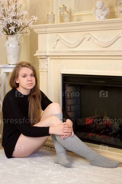 Красивая девушка у горящего камина