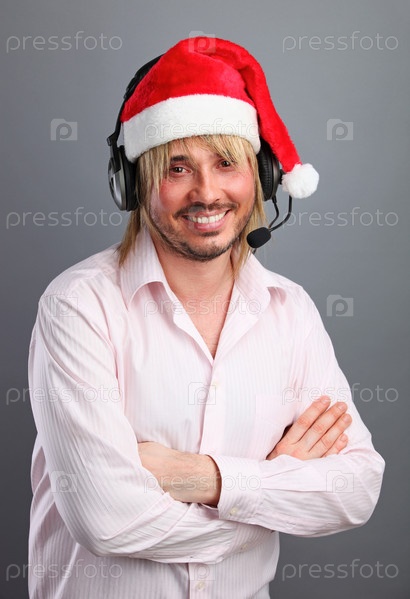 Европейский мужчина с гарнитурой и в рождественском колпаке