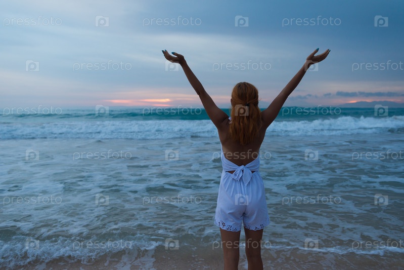 Молодая женщина стоит на берегу океана