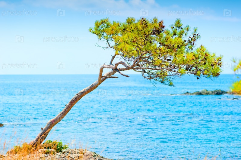 Пейзаж с одинокой сосной на фоне моря